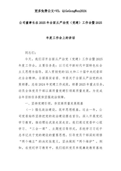 【七哥公文】2025年:【七哥公文】公司董事长在2025年全面从严治党(党建)工作会暨2025年度工作会上的讲话+更多免费公文+VX:QiGeGongWen2024+更多免费公文+VX:QiGeGongWen2024