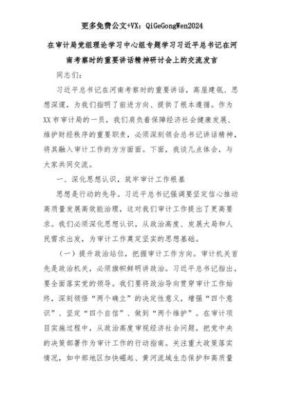 【七哥公文】2025年:【七哥公文】在审计局党组理论学习中心组专题学习习近平总书记在河南考察时的重要讲话精神研讨会上的交流发言+更多免费公文+VX:QiGeGongWen2024+更多免费公文+VX:QiGeGongWen2024