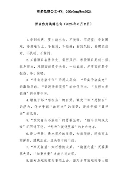 【七哥公文】2025年:【七哥公文】担当作为类排比句(2025年6月2日)+更多免费公文+VX:QiGeGongWen2024+更多免费公文+VX:QiGeGongWen2024