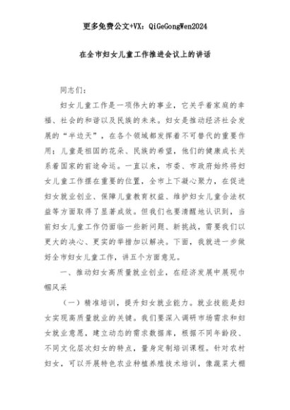 【七哥公文】2025年:【七哥公文】在全市妇女儿童工作推进会议上的讲话+更多免费公文+VX:QiGeGongWen2024+更多免费公文+VX:QiGeGongWen2024