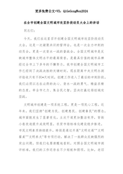 【七哥公文】2025年:【七哥公文】在全市创建全国文明城市攻坚阶段动员大会上的讲话+更多免费公文+VX:QiGeGongWen2024+更多免费公文+VX:QiGeGongWen2024