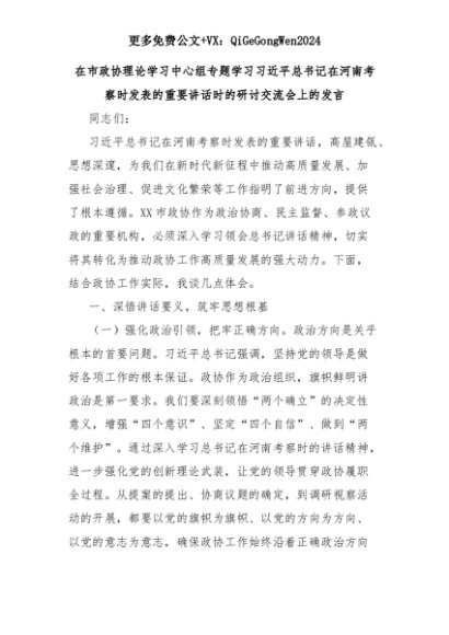 【七哥公文】2025年:【七哥公文】在市政协理论学习中心组专题学习习近平总书记在河南考察时发表的重要讲话时的研讨交流会上的发言+更多免费公文+VX:QiGeGongWen2024+更多免费公文+VX:QiGeGongWen2024