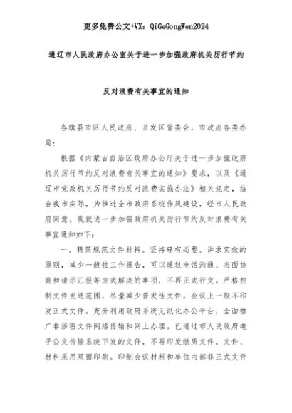 【七哥公文】2025年:【七哥公文】通辽市人民政府办公室关于进一步加强政府机关厉行节约反对浪费有关事宜的通知+更多免费公文+VX:QiGeGongWen2024+更多免费公文+VX:QiGeGongWen2024