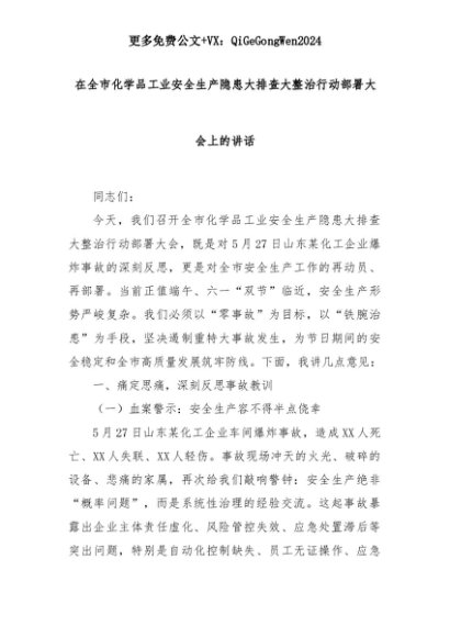 【七哥公文】2025年:【七哥公文】在全市化学品工业安全生产隐患大排查大整治行动部署大会上的讲话+更多免费公文+VX:QiGeGongWen2024+更多免费公文+VX:QiGeGongWen2024