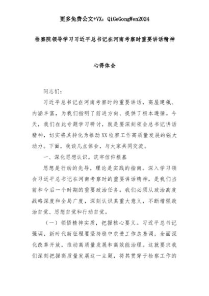 【七哥公文】2025年:【七哥公文】检察院领导学习习近平总书记在河南考察时重要讲话精神心得体会+更多免费公文+VX:QiGeGongWen2024+更多免费公文+VX:QiGeGongWen2024