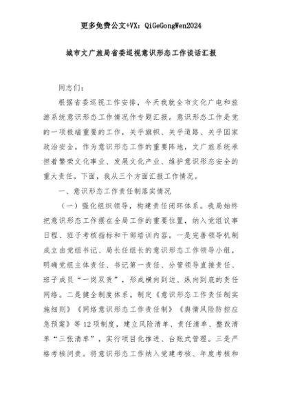 【七哥公文】2025年:【七哥公文】城市文广旅局省委巡视意识形态工作谈话汇报+更多免费公文+VX:QiGeGongWen2024+更多免费公文+VX:QiGeGongWen2024