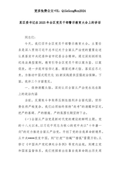 【七哥公文】2025年:【七哥公文】某区委书记在2025年全区党员干部警示教育大会上的讲话+更多免费公文+VX:QiGeGongWen2024+更多免费公文+VX:QiGeGongWen2024