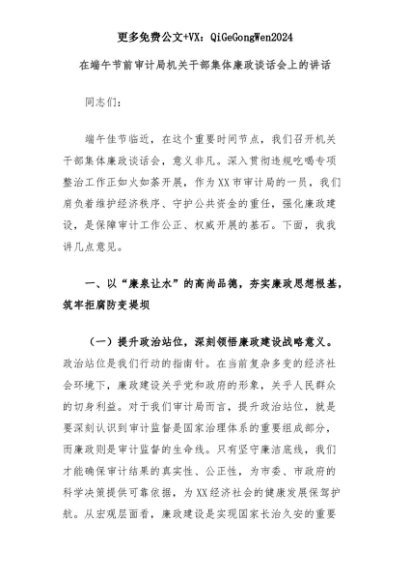 【七哥公文】2025年:【七哥公文】在端午节前审计局机关干部集体廉政谈话会上的讲话+更多免费公文+VX:QiGeGongWen2024+更多免费公文+VX:QiGeGongWen2024