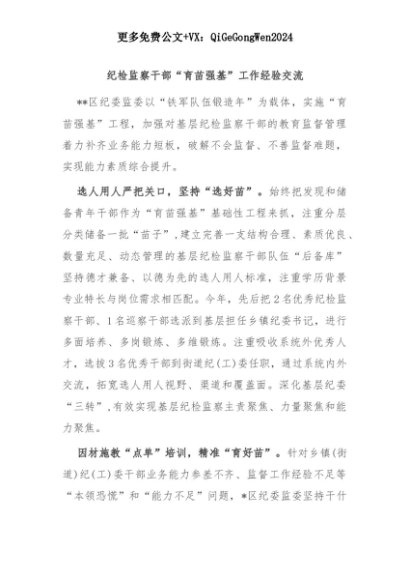 【七哥公文】2025年:【七哥公文】纪检监察干部“育苗强基”工作经验交流+更多免费公文+VX:QiGeGongWen2024+更多免费公文+VX:QiGeGongWen2024