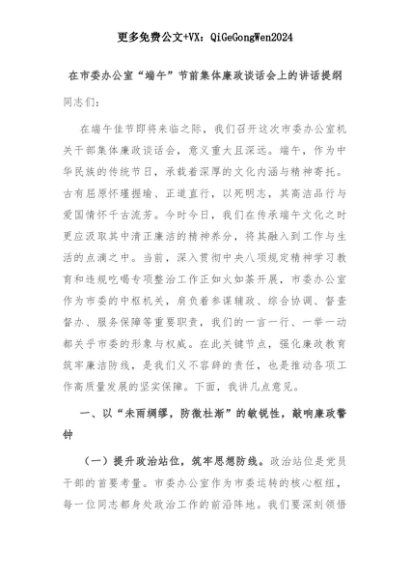 【七哥公文】2025年:【七哥公文】在市委办公室“端午”节前集体廉政谈话会上的讲话提纲+更多免费公文+VX:QiGeGongWen2024+更多免费公文+VX:QiGeGongWen2024
