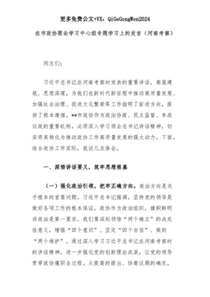 【七哥公文】2025年:【七哥公文】在市政协理论学习中心组专题学习上的发言(河南考察)+更多免费公文+VX:QiGeGongWen2024+更多免费公文+VX:QiGeGongWen2024