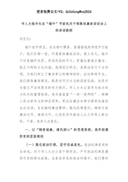 【七哥公文】2025年:【七哥公文】市人大秘书长在“端午”节前机关干部集体廉政谈话会上的讲话提纲+更多免费公文+VX:QiGeGongWen2024+更多免费公文+VX:QiGeGongWen2024
