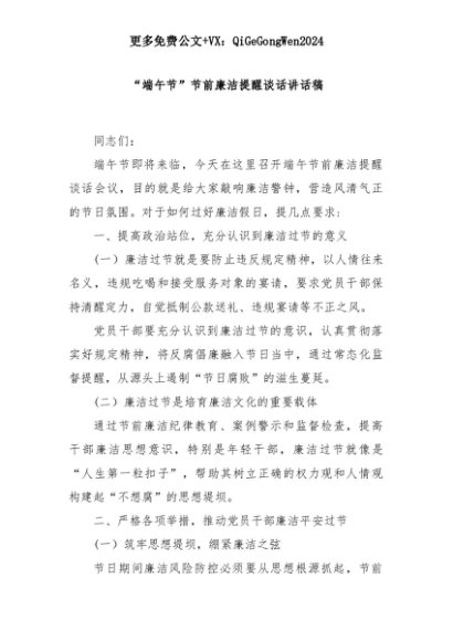 【七哥公文】2025年:【七哥公文】“端午节”节前廉洁提醒谈话讲话稿+更多免费公文+VX:QiGeGongWen2024+更多免费公文+VX:QiGeGongWen2024