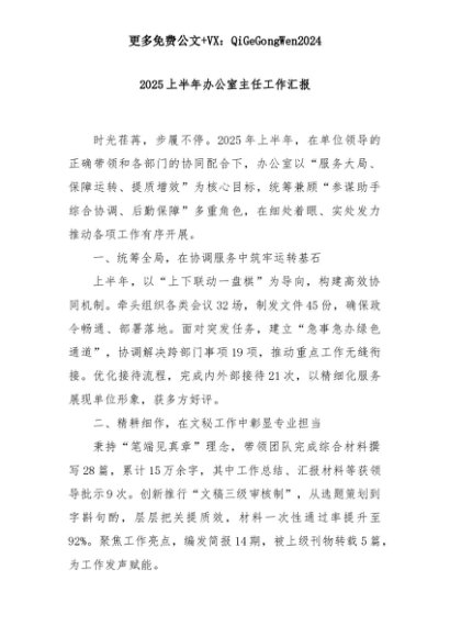 【七哥公文】2025年:【七哥公文】2025上半年办公室主任工作汇报+更多免费公文+VX:QiGeGongWen2024+更多免费公文+VX:QiGeGongWen2024