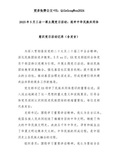 【七哥公文】2025年:【七哥公文】2025年5月三会一课主题党日活动:筑牢中华民族共同体意识党日活动记录(含发言)+更多免费公文+VX:QiGeGongWen2024+更多免费公文+VX:QiGeGongWen2024