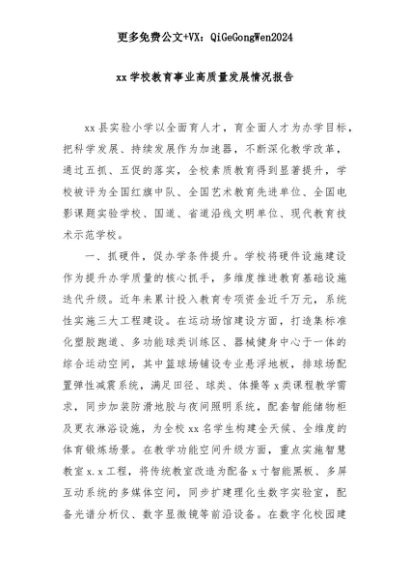 【七哥公文】2025年:【七哥公文】xx学校教育事业高质量发展情况报告+更多免费公文+VX:QiGeGongWen2024+更多免费公文+VX:QiGeGongWen2024