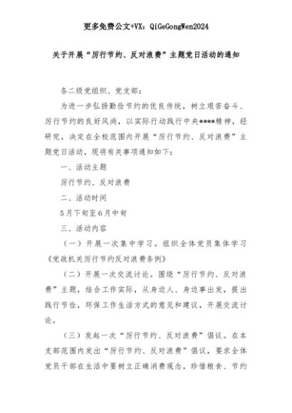 【七哥公文】2025年:【七哥公文】关于开展“厉行节约、反对浪费”主题党日活动的通知+更多免费公文+VX:QiGeGongWen2024+更多免费公文+VX:QiGeGongWen2024