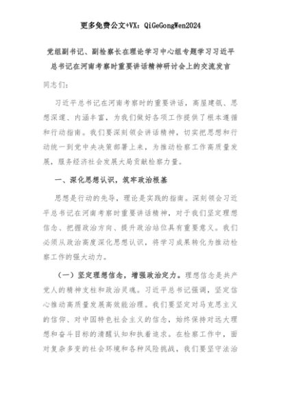 【七哥公文】2025年:【七哥公文】党组副书记、副检察长在理论学习中心组专题学习习近平总书记在河南考察时重要讲话精神研讨会上的交流发言+更多免费公文+VX:QiGeGongWen2024+更多免费公文+VX:QiGeGongWen2024
