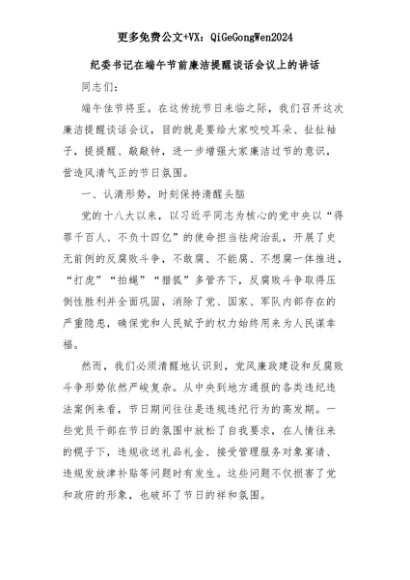 【七哥公文】2025年:【七哥公文】纪委书记在端午节前廉洁提醒谈话会议上的讲话+更多免费公文+VX:QiGeGongWen2024+更多免费公文+VX:QiGeGongWen2024