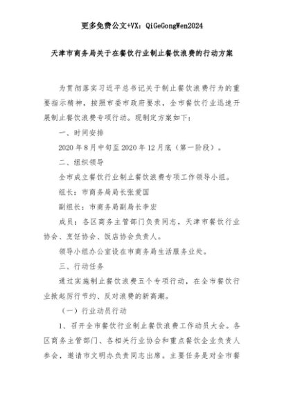 【七哥公文】2025年:【七哥公文】天津市商务局关于在餐饮行业制止餐饮浪费的行动方案+更多免费公文+VX:QiGeGongWen2024+更多免费公文+VX:QiGeGongWen2024