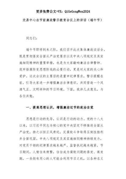 【七哥公文】2025年:【七哥公文】交易中心在节前廉政警示教育会议上的讲话(端午节)+更多免费公文+VX:QiGeGongWen2024+更多免费公文+VX:QiGeGongWen2024