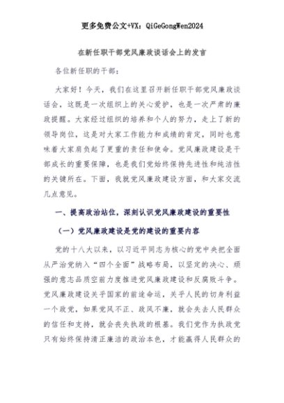 【七哥公文】2025年:【七哥公文】在新任职干部党风廉政谈话会上的发言+更多免费公文+VX:QiGeGongWen2024+更多免费公文+VX:QiGeGongWen2024
