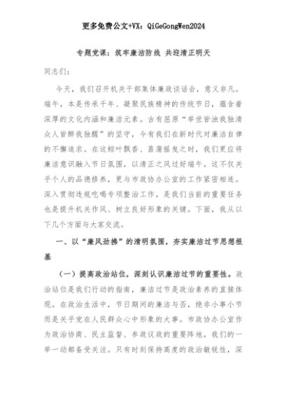 【七哥公文】2025年:【七哥公文】专题党课:筑牢廉洁防线 共迎清正明天+更多免费公文+VX:QiGeGongWen2024+更多免费公文+VX:QiGeGongWen2024