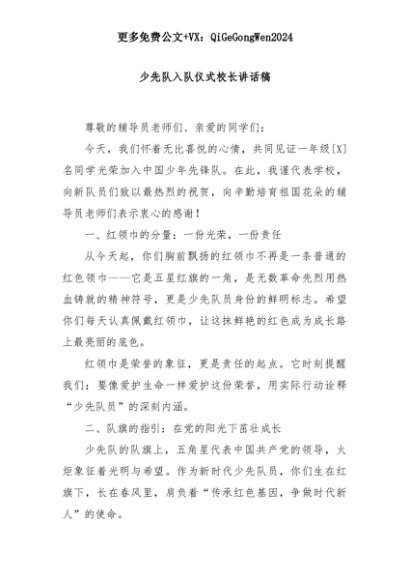 【七哥公文】2025年:【七哥公文】少先队入队仪式校长讲话稿+更多免费公文+VX:QiGeGongWen2024+更多免费公文+VX:QiGeGongWen2024