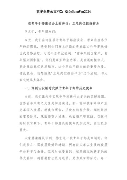 【七哥公文】2025年:【七哥公文】在青年干部座谈会上的讲话:立足岗位担当作为+更多免费公文+VX:QiGeGongWen2024+更多免费公文+VX:QiGeGongWen2024