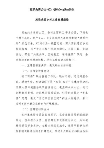 【七哥公文】2025年:【七哥公文】建设美丽乡村工作典型经验+更多免费公文+VX:QiGeGongWen2024+更多免费公文+VX:QiGeGongWen2024