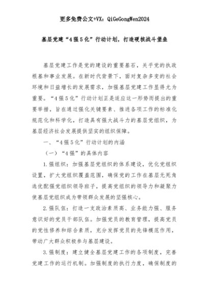 【七哥公文】2025年:【七哥公文】基层党建“4强5化”行动计划,打造硬核战斗堡垒+更多免费公文+VX:QiGeGongWen2024+更多免费公文+VX:QiGeGongWen2024