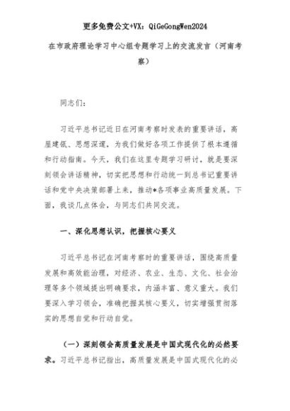 【七哥公文】2025年:【七哥公文】在市政府理论学习中心组专题学习上的交流发言(河南考察)+更多免费公文+VX:QiGeGongWen2024+更多免费公文+VX:QiGeGongWen2024