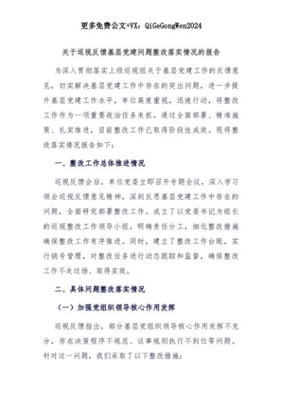 【七哥公文】2025年:【七哥公文】关于巡视反馈基层党建问题整改落实情况的报告+更多免费公文+VX:QiGeGongWen2024+更多免费公文+VX:QiGeGongWen2024
