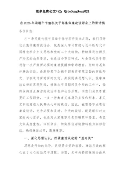 【七哥公文】2025年:【七哥公文】在2025年局端午节前机关干部集体廉政谈话会上的讲话稿+更多免费公文+VX:QiGeGongWen2024+更多免费公文+VX:QiGeGongWen2024