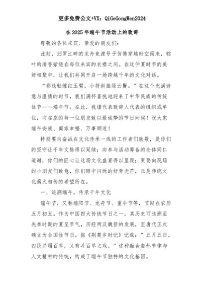 【七哥公文】2025年:【七哥公文】在2025年端午节活动上的致辞+更多免费公文+VX:QiGeGongWen2024+更多免费公文+VX:QiGeGongWen2024