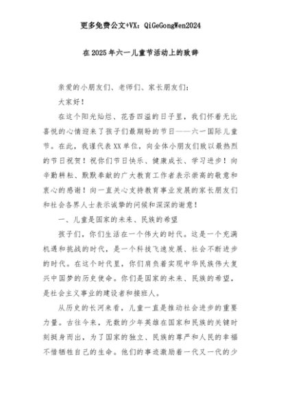 【七哥公文】2025年:【七哥公文】在2025年六一儿童节活动上的致辞+更多免费公文+VX:QiGeGongWen2024+更多免费公文+VX:QiGeGongWen2024