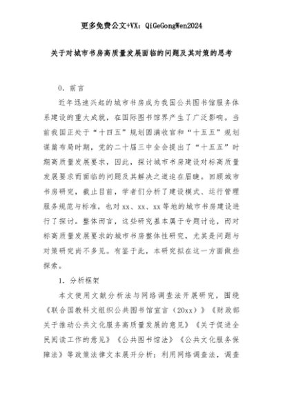 【七哥公文】2025年:【七哥公文】关于对城市书房高质量发展面临的问题及其对策的思考+更多免费公文+VX:QiGeGongWen2024+更多免费公文+VX:QiGeGongWen2024