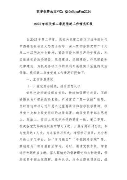 【七哥公文】2025年:【七哥公文】2025年机关第二季度党建工作情况汇报+更多免费公文+VX:QiGeGongWen2024+更多免费公文+VX:QiGeGongWen2024