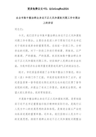 【七哥公文】2025年:【七哥公文】在全市集中整治群众身边不正之风和腐败问题工作专题会上的讲话+更多免费公文+VX:QiGeGongWen2024+更多免费公文+VX:QiGeGongWen2024