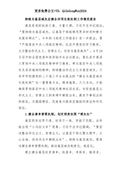 【七哥公文】2025年:【七哥公文】持续为基层减负应健全四项长效机制工作情况报告+更多免费公文+VX:QiGeGongWen2024+更多免费公文+VX:QiGeGongWen2024