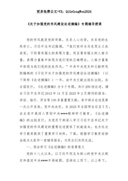 【七哥公文】2025年:【七哥公文】《关于加强党的作风建设论述摘编》专题辅导授课+更多免费公文+VX:QiGeGongWen2024+更多免费公文+VX:QiGeGongWen2024