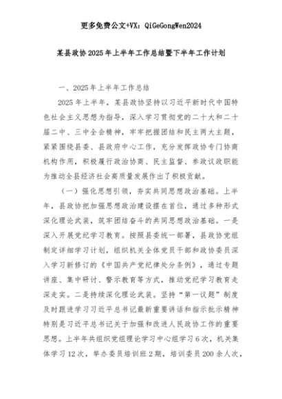 【七哥公文】2025年:【七哥公文】某县政协2025年上半年工作总结暨下半年工作计划+更多免费公文+VX:QiGeGongWen2024+更多免费公文+VX:QiGeGongWen2024