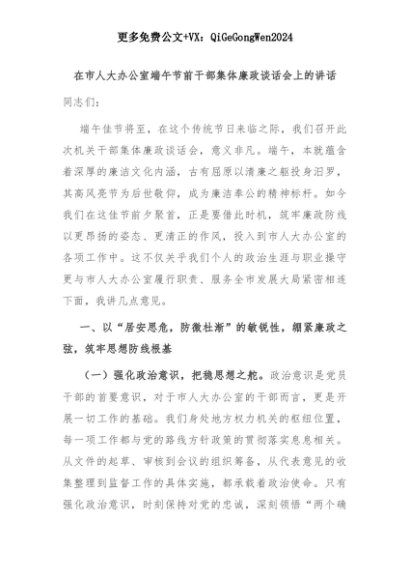 【七哥公文】2025年:【七哥公文】在市人大办公室端午节前干部集体廉政谈话会上的讲话+更多免费公文+VX:QiGeGongWen2024+更多免费公文+VX:QiGeGongWen2024