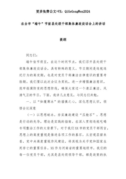 【七哥公文】2025年:【七哥公文】在全市“端午”节前县处级干部集体廉政谈话会上的讲话提纲+更多免费公文+VX:QiGeGongWen2024+更多免费公文+VX:QiGeGongWen2024
