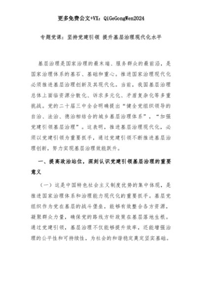 【七哥公文】2025年:【七哥公文】专题党课:坚持党建引领 提升基层治理现代化水平+更多免费公文+VX:QiGeGongWen2024+更多免费公文+VX:QiGeGongWen2024