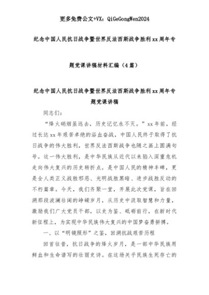 【七哥公文】2025年:【七哥公文】(4篇)纪念中国人民抗日战争暨世界反法西斯战争胜利xx周年专题党课讲稿材料汇编+更多免费公文+VX:QiGeGongWen2024+更多免费公文+VX:QiGeGongWen2024