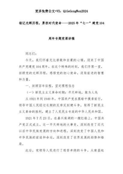 【七哥公文】2025年:【七哥公文】铭记光辉历程,勇担时代使命——2025年“七一”建党104周年专题党课讲稿+更多免费公文+VX:QiGeGongWen2024+更多免费公文+VX:QiGeGongWen2024