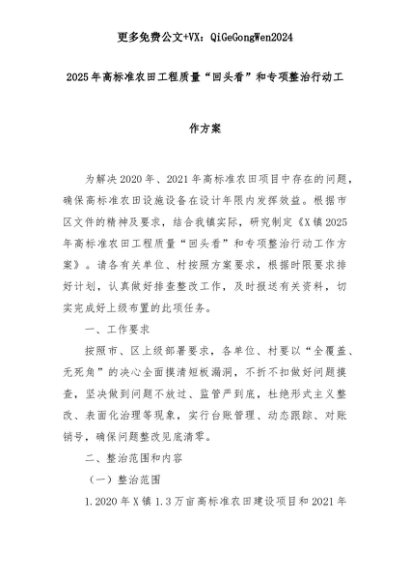 【七哥公文】2025年:【七哥公文】2025年高标准农田工程质量“回头看”和专项整治行动工作方案+更多免费公文+VX:QiGeGongWen2024+更多免费公文+VX:QiGeGongWen2024