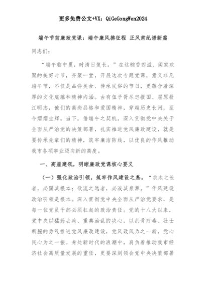 【七哥公文】2025年:【七哥公文】端午节前廉政党课:端午廉风拂征程 正风肃纪谱新篇+更多免费公文+VX:QiGeGongWen2024+更多免费公文+VX:QiGeGongWen2024