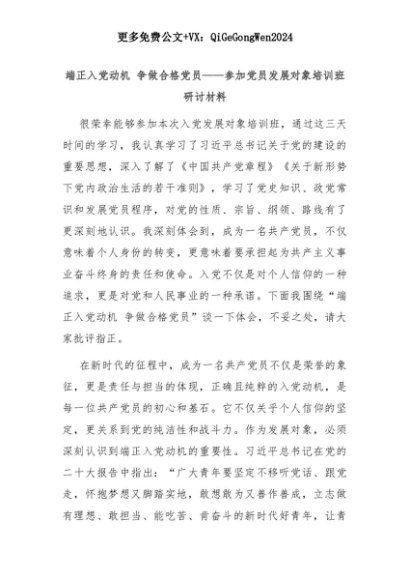 【七哥公文】2025年:【七哥公文】端正入党动机 争做合格党员——参加党员发展对象培训班研讨材料+更多免费公文+VX:QiGeGongWen2024+更多免费公文+VX:QiGeGongWen2024